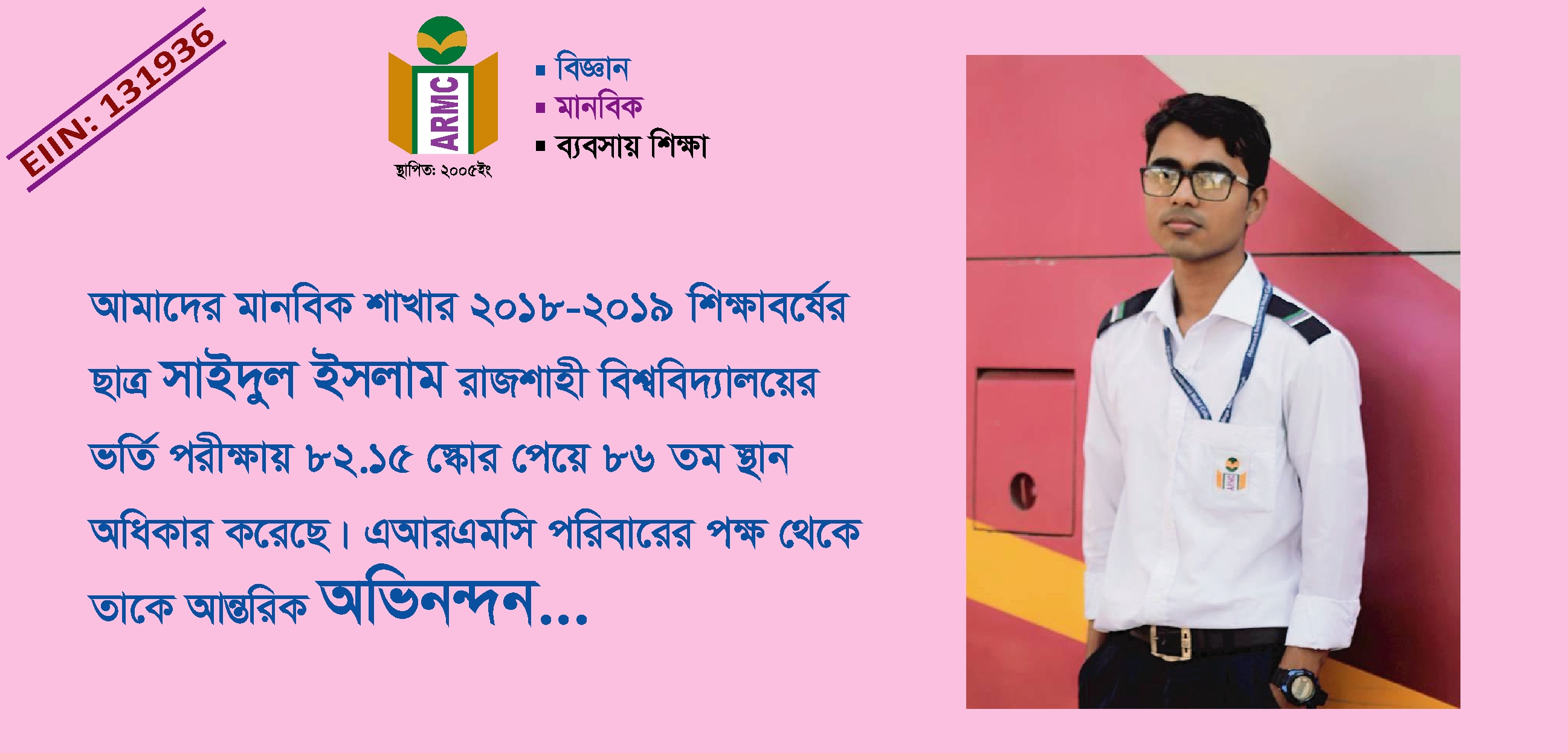 আমাদের মানবিক শাখার ২০১৮-২০১৯ শিক্ষাবর্ষের ছাত্র সাইদুল ইসলাম রাজশাহী  বিশ্ববিদ্যালয়ের ভর্তি পরীক্ষায় ৮২.১৫ স্কোর পেয়ে ৮৬ তম স্থান অধিকার করেছে। এআরএমসি পরিবারের পক্ষ থেকে তাকে আন্তরিক অভিনন্দন...
